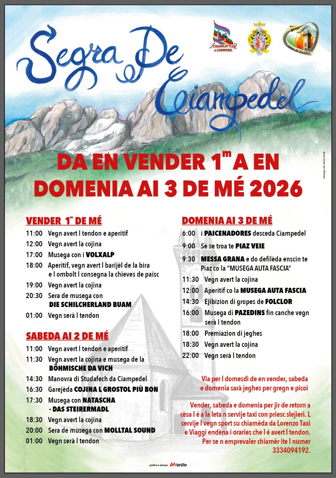 Descrizione Dalle 11 di venerdì 1° maggio alle 22 di domenica 3 Maggio 2026 te Piaz de Ciampedel - Tendonvia per l domesdì dei 3 dis, sarà jeghes per gregn e picoi