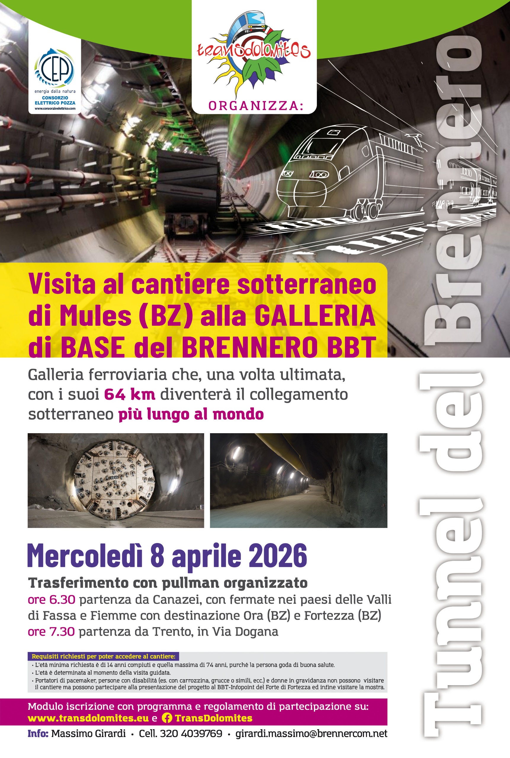 Visita al cantiere di Mules La galleria di Base del Brennero 8 aprile 2026 BBT Infopoint c/o Forte di Fortezza, via Brennero, 39045 Fortezza (BZ) Premessa La Galleria di Base del Brennero è un sistema di gallerie che si sviluppa per una lunghezza complessiva di 230 km. Ad oggi sono già stati scavati 166 km di gallerie. Attualmente sono quattro cantieri attivi, uno sul territorio italiano e tre sul territorio austriaco.